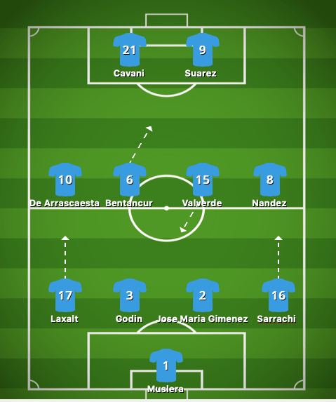 Shows how Uruguay can play now with a more dynamic full-back in Laxalt who will push forward if necessary, while the midfielders will alternate which ever pushes forward or stays back. (Uruguays best team IMO)